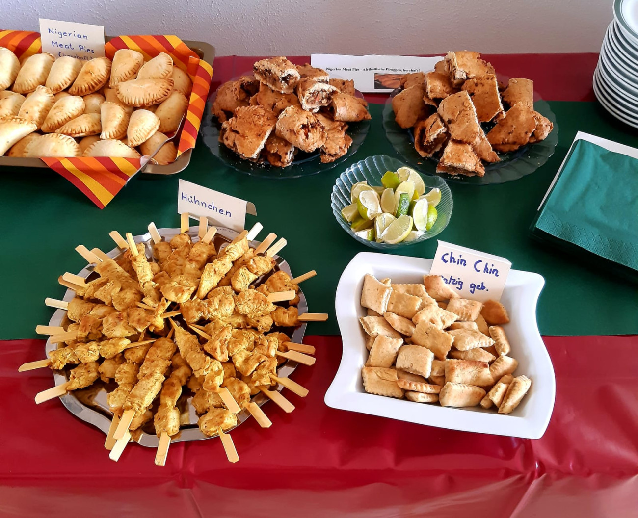 Nach dem Gottesdienst hatten die Besucherinnen und Besucher die Möglichkeit, das Land auch kulinarisch zu erfahren: Fleißige Helferinnen und Helfer hatten landestypische Rezepte ausprobiert und verköstigten die Gäste mit süßen und herzhaften Speisen wie Jollof-Reis, Erdnuss-Suppe, Fleischpasteten, nigerianischen Krapfen (genannt Puff Puff), Kokosbällchen und dem Cocktail Chapman.
